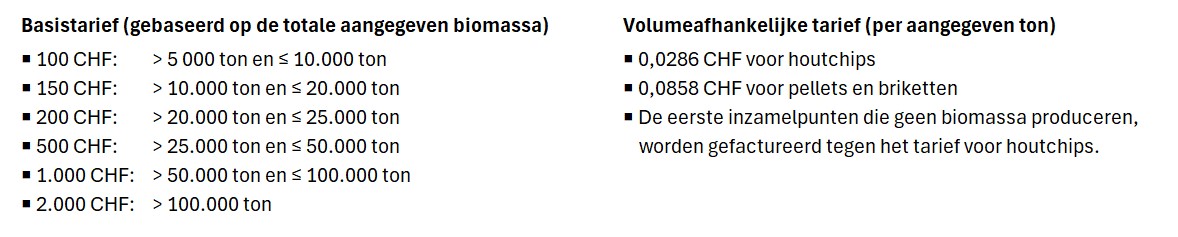- Biomassa gedeclareerd: - ≤ 5.000 ton/jaar: vaste kost van 238 CHF;